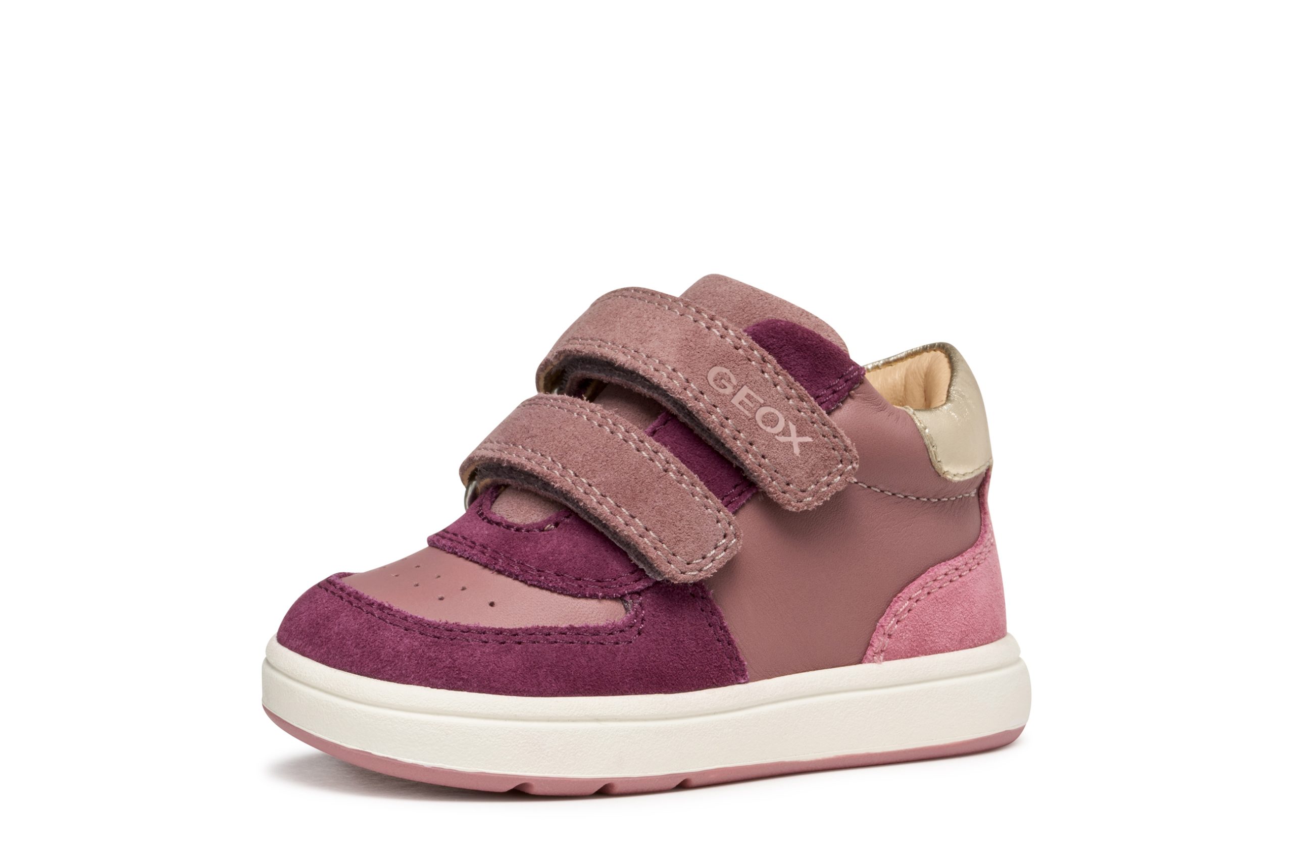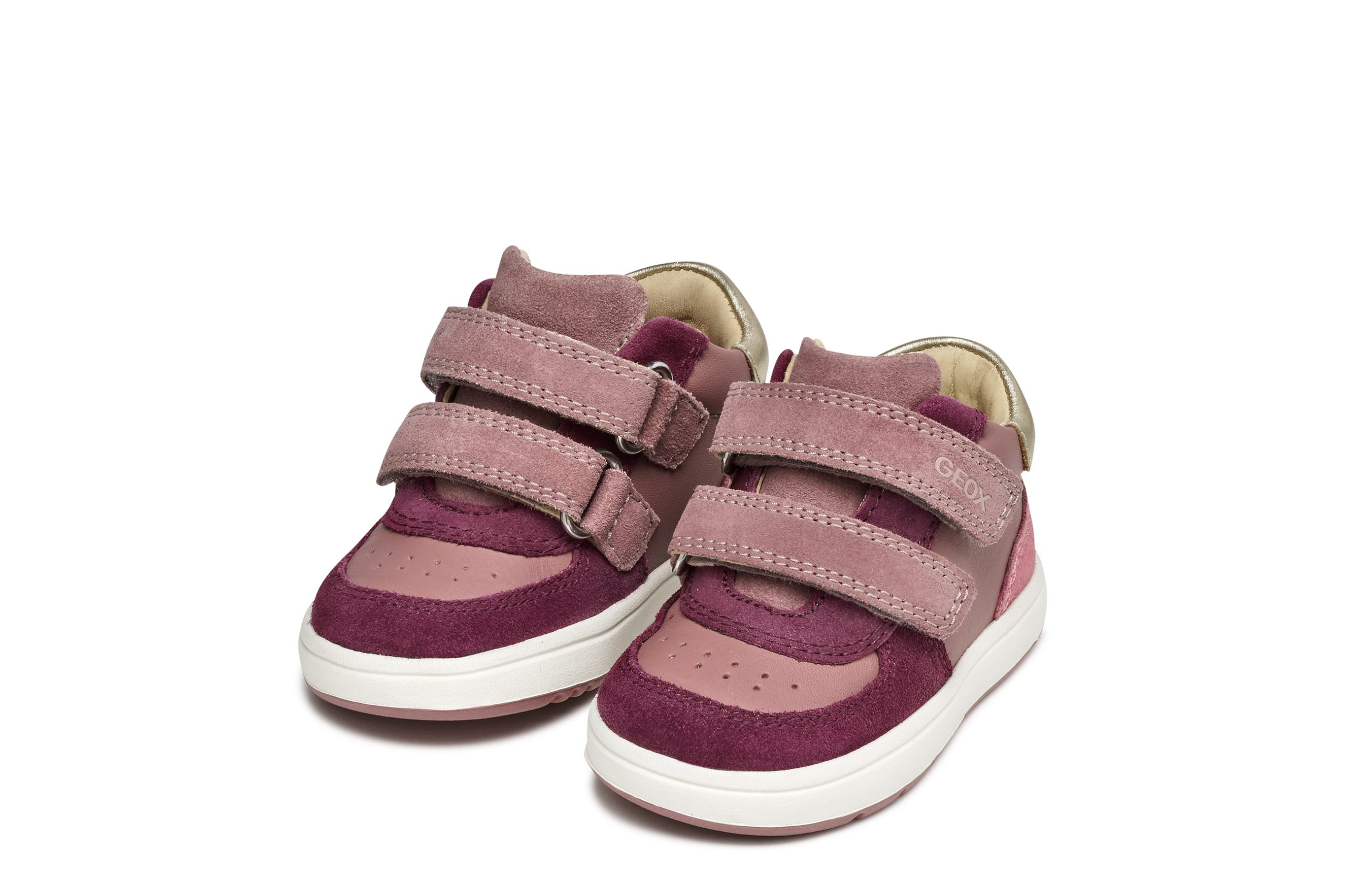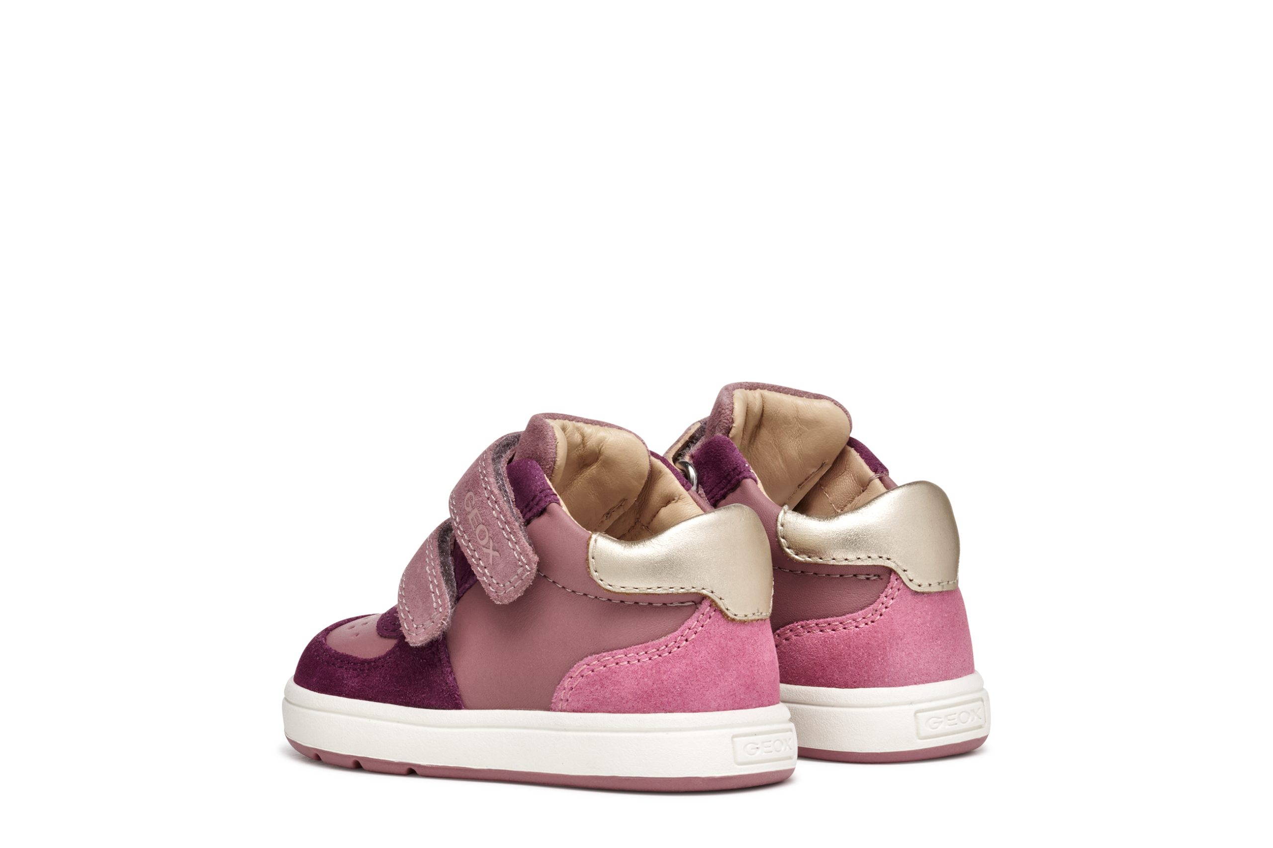 Mid-cut first-steps sneaker for baby girls with a supple flexible structure designed to provide children with stability and safety as they start to explore the world. This version has been crafted from nappa and suede in a rose and dark-purple colourway, and delivers outstanding comfort. Biglia is a product of the partnership between Geox and the Italian Association of Podiatrists and boasts a casual modern design that encourages the proper development of growing feet.