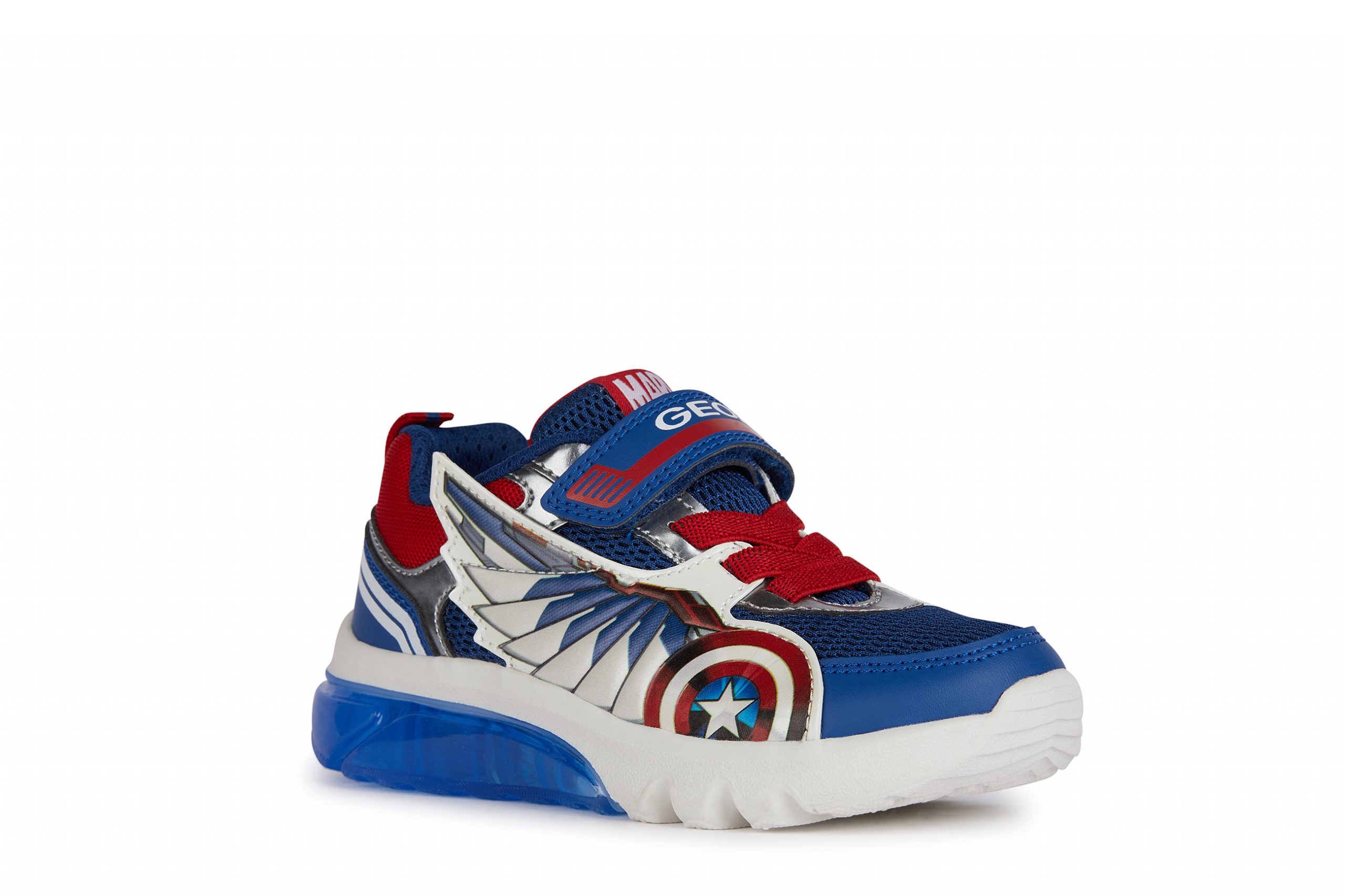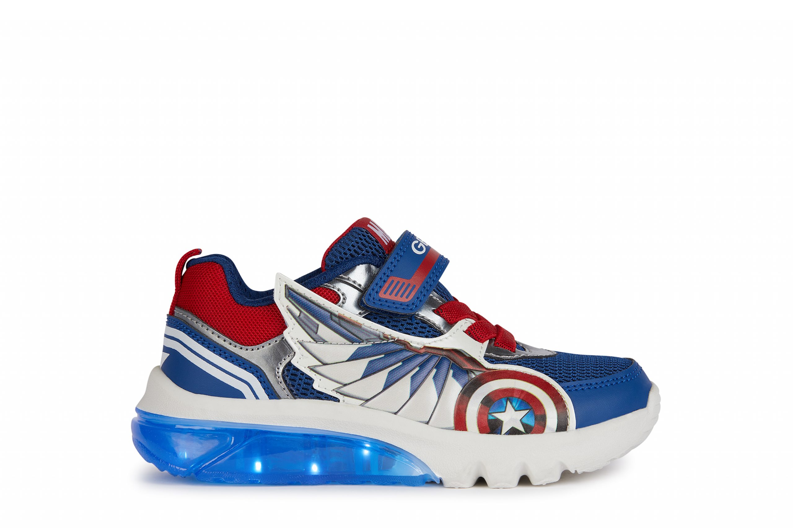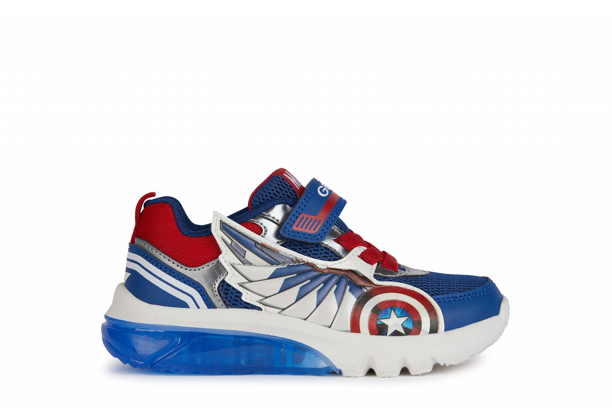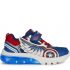 Cushioned and breathable boys’ sneakers with a sporty and dynamic vibe, featuring lights built into the outsole. This model combines blue and red, the iconic colors of the Captain America Avengers superheroes, and showcases an upper embellished with 3D appliqués. A product of the partnership between Geox and Marvel, Ciberdron is crafted from mesh and a leather-effect material, and is the perfect companion for school days and playtime alike.