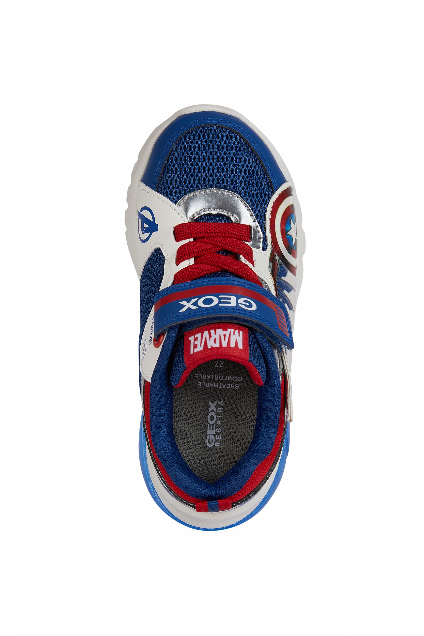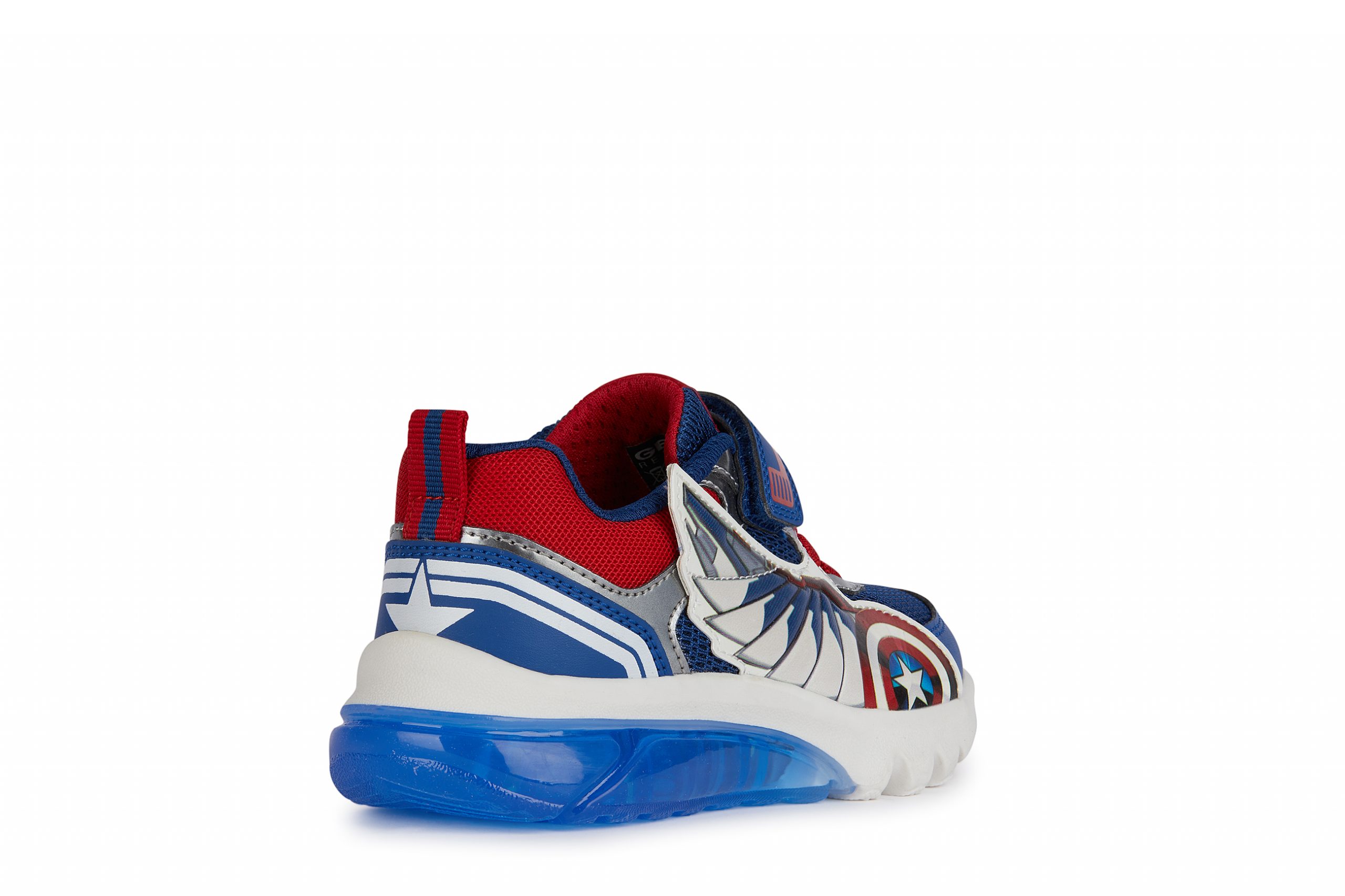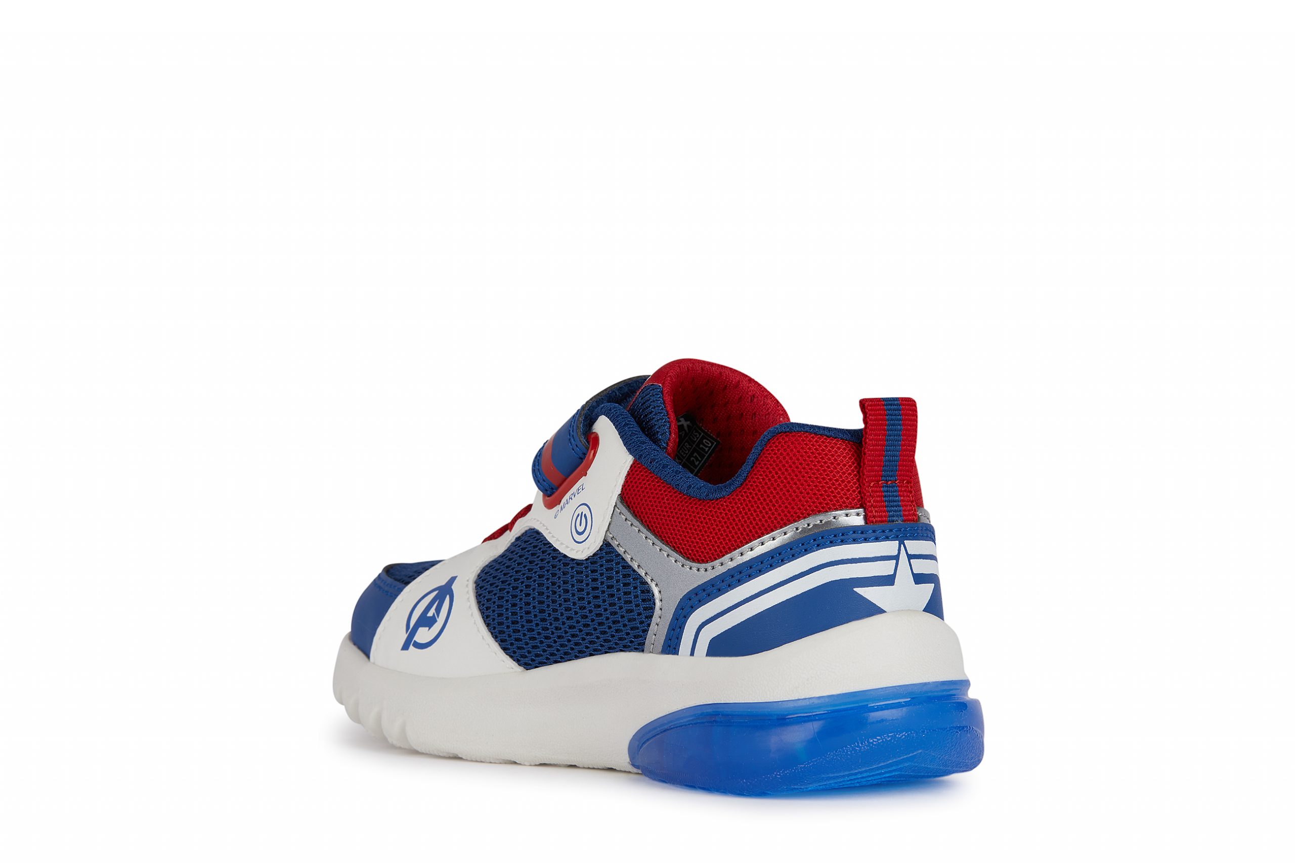 Cushioned and breathable boys’ sneakers with a sporty and dynamic vibe, featuring lights built into the outsole. This model combines blue and red, the iconic colors of the Captain America Avengers superheroes, and showcases an upper embellished with 3D appliqués. A product of the partnership between Geox and Marvel, Ciberdron is crafted from mesh and a leather-effect material, and is the perfect companion for school days and playtime alike.