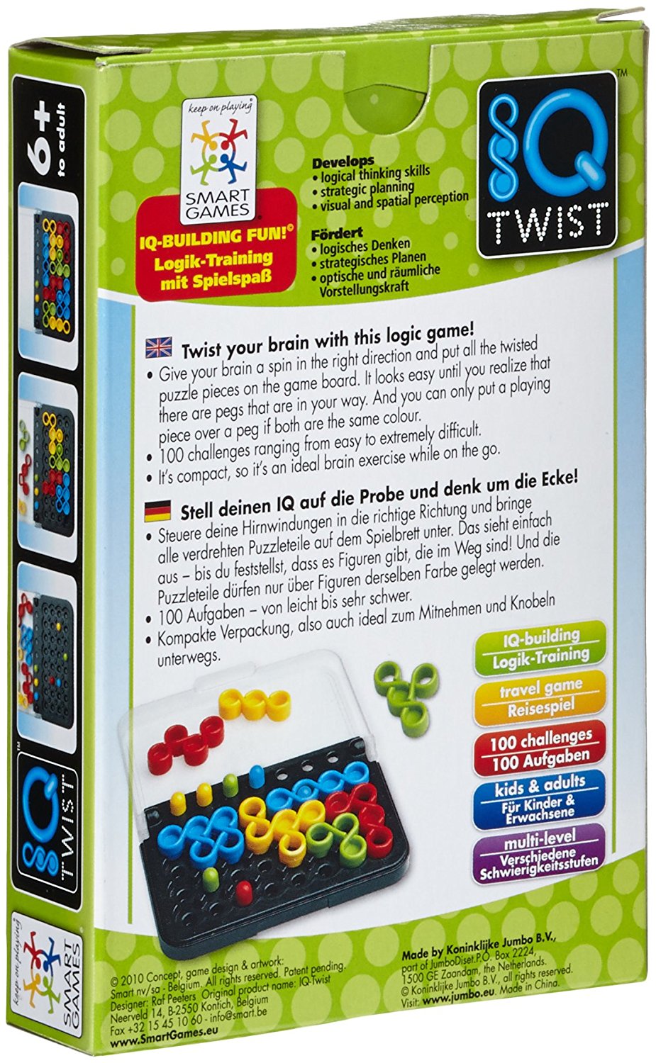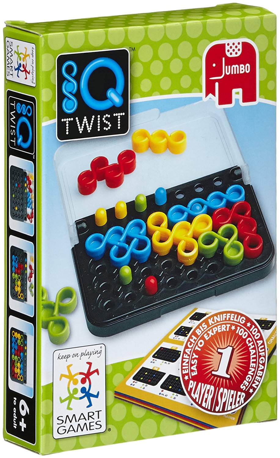 IQ Twist is a logical 2D brainteaser for young and older fans of single-player brainteaser games and is a great way to test your spatial perception skills. It’s a compact game which can be easily stored away or placed in your pocket or bag when you’re on your travels out and about. There are 101 fun and exciting challenges for you to enjoy in 5 levels of difficulty ranging from Starter to Wizard. The challenge booklet includes a ‘How to Play’ section, and contains the solutions to all the challenges for you to check when you think you have finished. A quick hot to play: (1) Open the box and remove the 8 twisted playing pieces. Select the challenge you wish to attempt and place the coloured pegs in the spaces that are highlighted in the challenge booklet. Once you have positioned the pegs, you cannot move them. (2) The aim of the challenge is to now place all the twisted pieces on the game board. You can only put a twisted piece over the same colour peg that is on the game board, and only if there is a hole that the peg can slot into. You can use the twisted pieces whichever way up you want. (3) When you believe that you have finished the challenge, you can look at the back of the challenge booklet at the solution to see if you were correct. If you are, then move onto a new challenge. What makes this brainteaser even greater is that it is so compact and the challenge booklet can be stored inside the game box which makes storing easy and the perfect game to take with you. IQ Twist is suitable for adults, and children aged 6+. Smart Games are the fun and exciting single player brainteasers for boys and girls of all ages. Each game has a variety of challenges and difficulties to test your child’s skills and have been designed to help them improve their problem solving and memory skills.