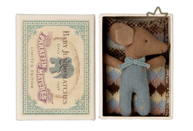A classic Maileg item. This mouse is ready for hours of play and sleeps tight in his little matchbox. The clothes and bed linen are made of soft fabrics with unique prints and beautiful colours.